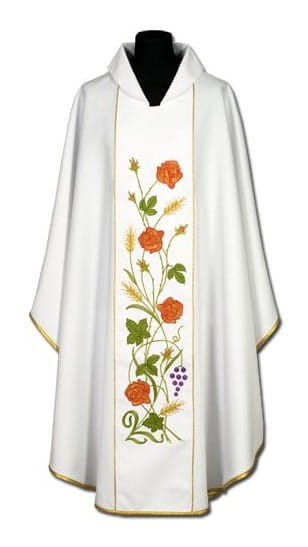 Casula con una banda ricamata. Composizione tessuto : 54% lana e 46% poliestere. Spedita con la stola. Lunghezza 125 cm