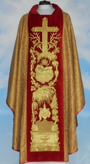 Casula in damasco ricco ricamata. Spedita con la stola. Lunghezza 125 cm.