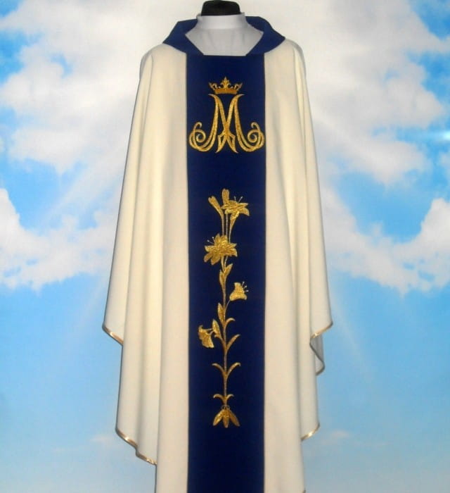 Casula ricamata Mariale. Spedita con la stola. Tessuto leggero di poliestere.