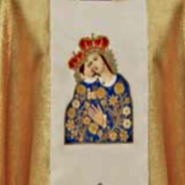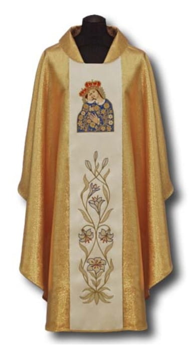 Casula ricamata con l'immagine di Nostra Signora di Kalwaria Zebrzydowska. Spedita con la stola. Tessuto poliestere. Lunghezza 125 cm