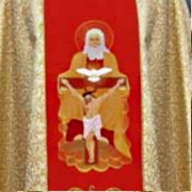 Casula ricamata con l'immagine della Santa Trinità. Spedita con la stola. Tessuto poliestere. Lunghezza 125 cm