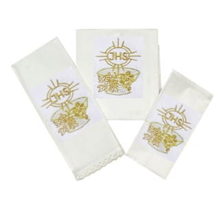 Set di Servizio da messa realizzato in cotone e decorato di merletto. Questo modello di completo é composto di purificatoio,manutergio e corporale.